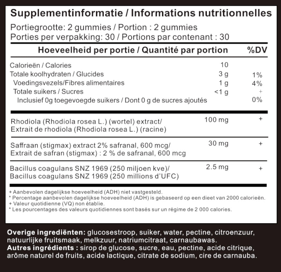 🦠 Bacillus coagulans SNZ 1969 (2.5 billion CFU) – A robust probiotic strain that supports gut health, which plays a vital role in mood regulation and overall stress balance.