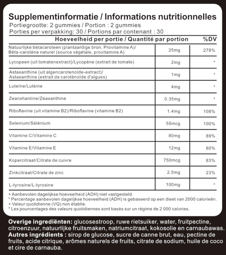Formulated with a powerful blend of plant-based provitamin A (beta-carotene), tomato extract (lycopene), lutein, astaxanthin, and zeaxanthin, these gummies help your skin develop a natural golden tone while protecting against oxidative stress.